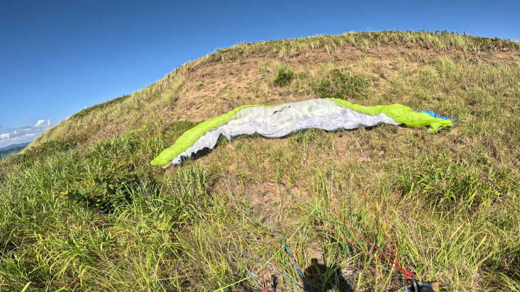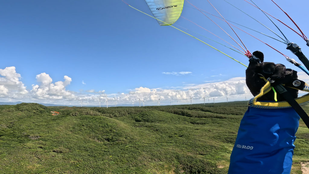 一番乗りで到着。本日は忘れず持ってきた風速計で風速確認。7m/sでちょっと弱めですが、リッジは取れそう。テイクオフ後ろに飛ばされないように2Kgの水分補給兼重りのペットボトルを搭載してテイクオフ。立ち上げてみると結構風がサイド。リッジ取りにくいが、何とか上げる。