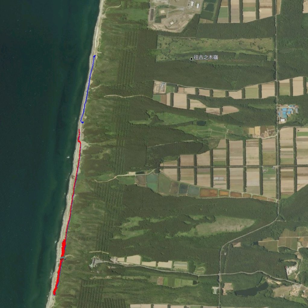 グライダーの絵がテイクオフ。大体今回は端から端で3㎞ほど飛んでみました。途切れているところが沢がありリッジ帯が切れている部分。風がよほどよく高度がないと渡れない。でも青色ラインのところは護岸コンクリートとテトラポットが続いており、ランディング危ないので北側は赤いラインの先の沢までが安心して飛べるようです。それでも2㎞くらいのリッジ帯はあります。次は南側の調査ですね。