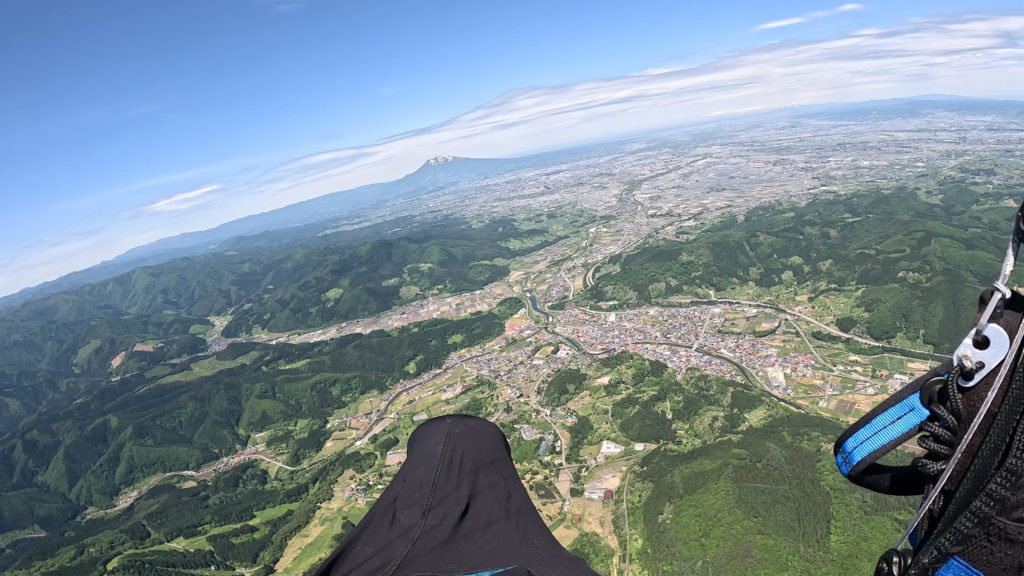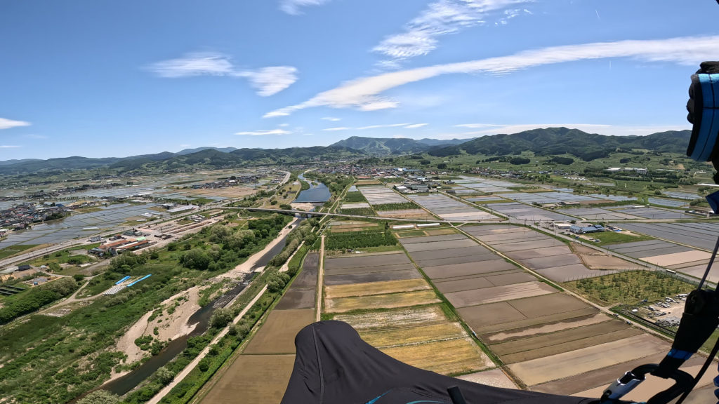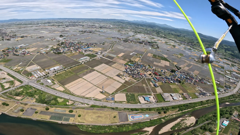 弱い西風かな?アクセル一段目で42~3km/h出る。サクッと大鰐の町を超えて、今回からいつもと違うコースを進む。いつも川沿いルートを使いますが、なかなか上がらないのでちょっと迂回して高速道路沿いを進む。トンネルとその付近の小山はサーマルあるが小さい、でも高度ロスは少ない、インター上空も上がるが、弱いサーマルのみ、でもタイミング次第ではやはり上げれるポイント。時間帯とタイミングでは十分上げ直せそう。とりあえず今回は良いサーマル捕まえられず、それでも弱いサーマルで何回か上げ直し、+400mでいつもの7号河川敷へ。ここで潰されるほどの強烈なサーマルゲット。しかし、すでに河川敷上空はかなり強い北東の風。流されて捕まえきれず。